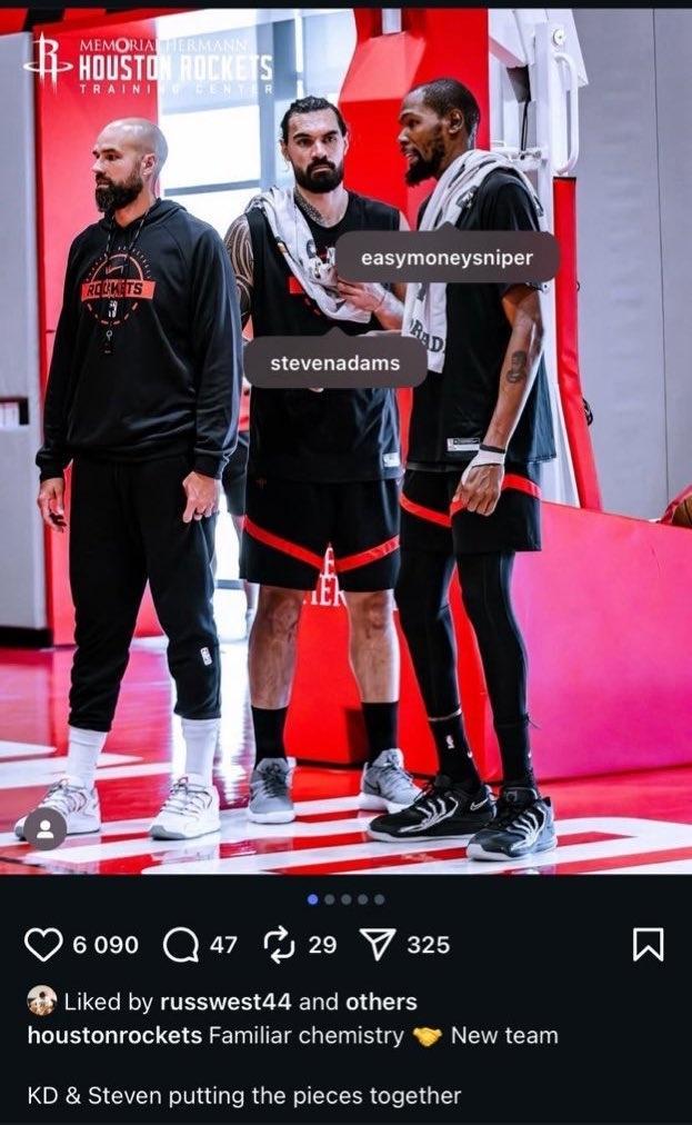 至于威少曾经短暂效力过火箭一个赛季,当时与昔日雷霆队友哈登搭档,但遗憾止步西部半决赛。威少在雷霆时期曾经与杜兰特、亚当斯搭档过,如今威少通过社媒点赞了火箭官推发布的这张照片,自然是耐人寻味。