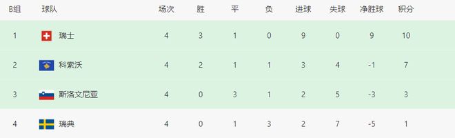 这场失利之后,瑞典4场0胜!1平3负仅积1分,他们落后榜首瑞士9分,只剩两轮,已彻底无缘小组头名。而争夺第二的希望同样渺茫,落后科索沃6分、净胜球少4个,难道化身为送分童子的瑞典就要彻底无缘世界杯了吗?