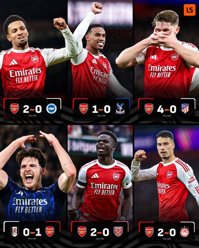 在整个10月的赛程里,阿森纳相继以2-0轻取奥林匹亚科斯(欧冠,主场)、2-0轻取西汉姆联(英超,主场)、1-0力克富勒姆(英超,客场)、4-0大胜马德里竞技(欧冠,主场)、1-0力克水晶宫(英超,主场)和2-0轻取布莱顿(英联杯,主场)。