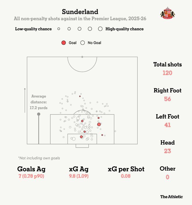桑德兰取得了出色的开局,但他们本赛季的主要目标仍然是保级。桑德兰虽然在联赛中被射门次数第三多,但这些射门的平均质量较低。他们的每次射门预期进球(xG)仅为0.08——仅次于阿森纳和纽卡斯尔——而平均射门距离则大约在禁区边缘。如果他们继续限制对手进行远射,他们会非常安全。