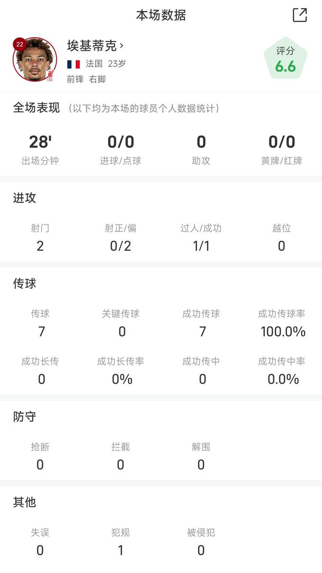 雷速体育10月20日讯 在今天凌晨结束的英超双红会中,利物浦前锋埃基蒂克替补出场28分钟未能救主。
